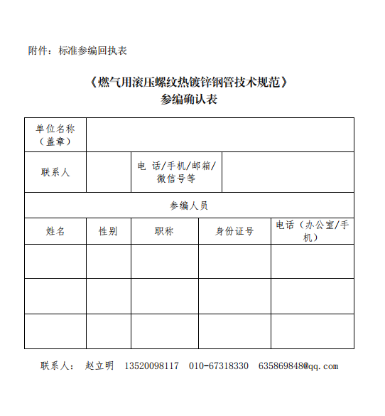 主要內(nèi)容包括:滾壓螺紋技術(shù)壓制外管螺紋的熱鍍鋅鋼管的尺寸、外形、技術(shù)要求、實(shí)驗(yàn)方法、檢驗(yàn)規(guī)則、包裝、標(biāo)志及質(zhì)量證明書。為使本標(biāo)準(zhǔn)更具專業(yè)性和市場(chǎng)適用性,特邀請(qǐng)涉及滾壓螺紋工藝相關(guān)技術(shù)領(lǐng)域單位共同參與本標(biāo)準(zhǔn)的制定,請(qǐng)有意向參與的單位填寫附件中回執(zhí)表報(bào)名參編工作。