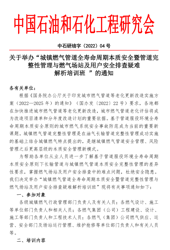 “城鎮(zhèn)燃?xì)夤艿廊珘勖芷诒举|(zhì)安全暨管道完整性管理與燃?xì)鈭?chǎng)站及用戶安全排查疑難解析培訓(xùn)班 ”的通知