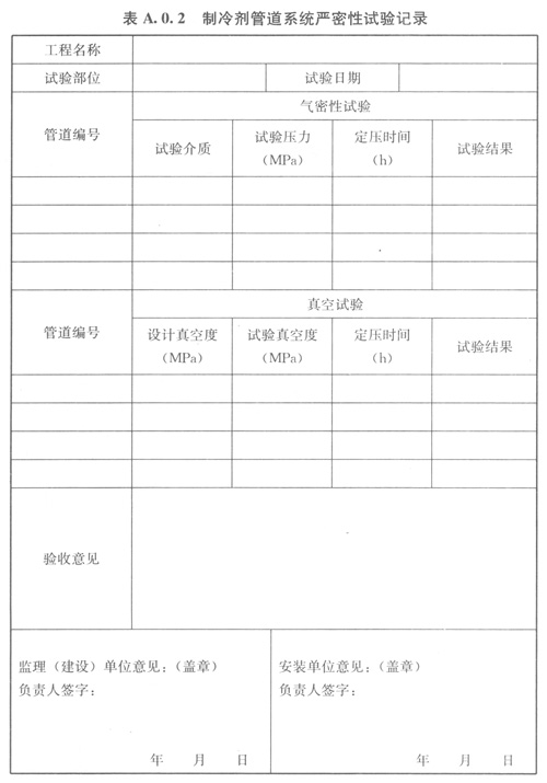 A02制冷劑管道系統(tǒng)嚴(yán)密性試驗(yàn)記錄可按表A02的格式記錄。