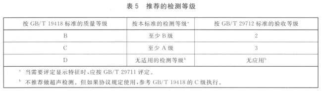 當規(guī)定使用ISO 17635時,表5給出了推薦的檢測等級和驗收等級。