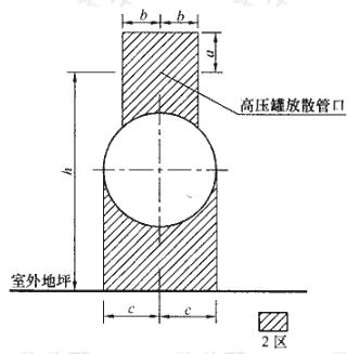 以儲(chǔ)罐安全放散閥放散管管口為中心,當(dāng)管口高度h距地坪大于4.5m時(shí),半徑b為3m,頂部距管口a為5m(當(dāng)管口高度h距地坪小于等于4.5m時(shí),半徑b為5m,頂部距管口a為7.5m)以及管口到地坪以上的范圍為2區(qū)。