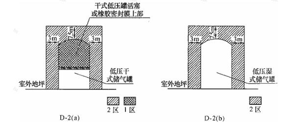 圖D-2 露天設(shè)置的低壓儲(chǔ)氣罐的爆炸危險(xiǎn)區(qū)域等級(jí)和范圍劃分