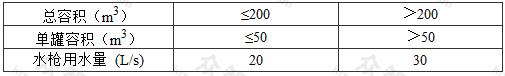 2 總?cè)莘e小于50m3且單罐容積小于等于20m3的液化天然氣儲(chǔ)罐或儲(chǔ)罐區(qū),可單獨(dú)設(shè)置固定噴淋裝置或移動(dòng)水槍?zhuān)湎浪繎?yīng)按水槍用水量計(jì)算。