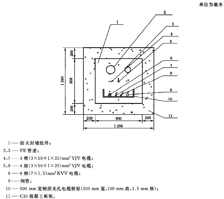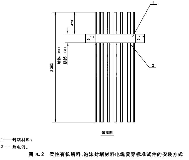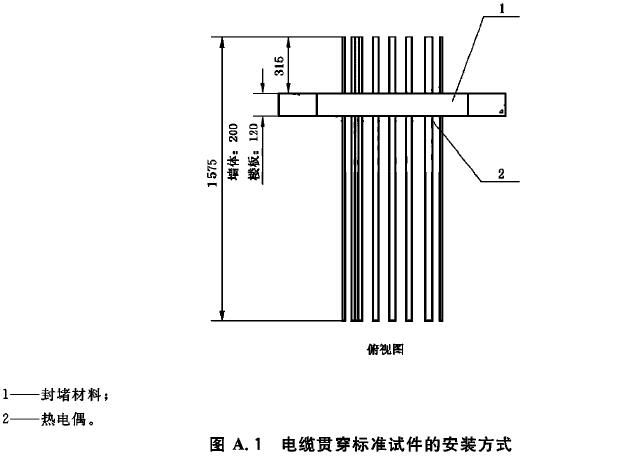 A.10 在電纜貫穿標(biāo)準(zhǔn)試件和防火封堵組件標(biāo)準(zhǔn)試件的防火封堵材料表面,距離每種貫穿物25mm處各布置一支熱電偶。在每種貫穿物表面距背火面25mm處布置一支熱電偶。當(dāng)貫穿物背火面作了絕熱處理或有涂層時(shí),在貫穿物上距離絕熱層或涂層邊緣25mm處布置熱電偶。其他任何可疑點(diǎn)均可設(shè)置熱電偶。