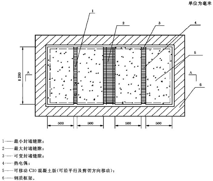 A.7 框架內(nèi)用于支撐縫隙的板材為C30混凝土板(砼板受火面保護(hù)層厚度為10mm)。對(duì)于縫隙封堵材料,可根據(jù)委托方的要求,在實(shí)施耐火試驗(yàn)前或試驗(yàn)過程中采用機(jī)械的方式移動(dòng)縫隙,移動(dòng)方式可以是沿被支撐的平面移動(dòng)縫隙的寬度,也可以是沿剪切方向或其他方向移動(dòng),移動(dòng)的最大距離應(yīng)根據(jù)縫隙封堵材料的性能由委托方確定。