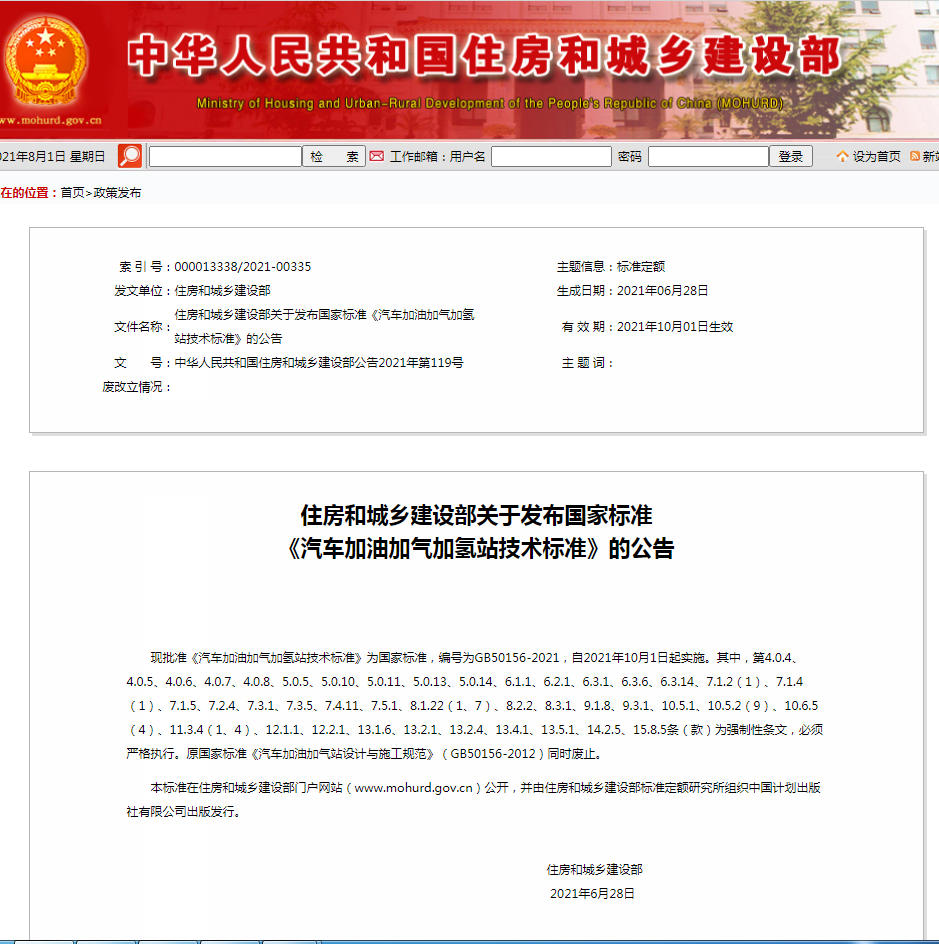 現(xiàn)批準(zhǔn)《汽車加油加氣加氫站技術(shù)標(biāo)準(zhǔn)》為國家標(biāo)準(zhǔn),編號為GB50156-2021,自2021年10月1日起實施。其中,第4.0.4、4.0.5、4.0.6、4.0.7、4.0.8、5.0.5、5.0.10、5.0.11、5.0.13、5.0.14、6.1.1、6.2.1、6.3.1、6.3.6、6.3.14、7.1.2(1)、7.1.4(1)、7.1.5、7.2.4、7.3.1、7.3.5、7.4.11、7.5.1、8.1.22(1、7)、8.2.2、8.3.1、9.1.8、9.3.1、10.5.1、10.5.2(9)、10.6.5(4)、11.3.4(1、4)、12.1.1、12.2.1、13.1.6、13.2.1、13.2.4、13.4.1、13.5.1、14.2.5、15.8.5條(款)為強制性條文,必須嚴(yán)格執(zhí)行。原國家標(biāo)準(zhǔn)《汽車加油加氣站設(shè)計與施工規(guī)范》(GB50156-2012)同時廢止。