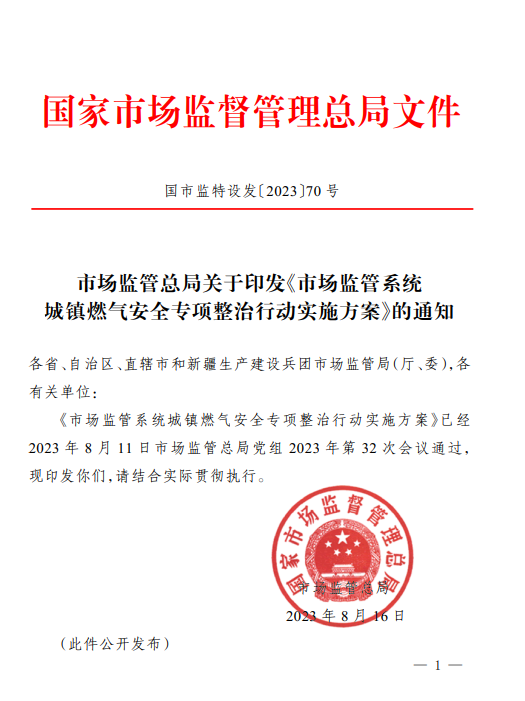 市場監(jiān)管總局關(guān)于印發(fā)《市場監(jiān)管系統(tǒng)城鎮(zhèn)燃?xì)獍踩珜m?xiàng)整治行動(dòng)實(shí)施方案》(國市監(jiān)特設(shè)發(fā)〔2023〕70號)