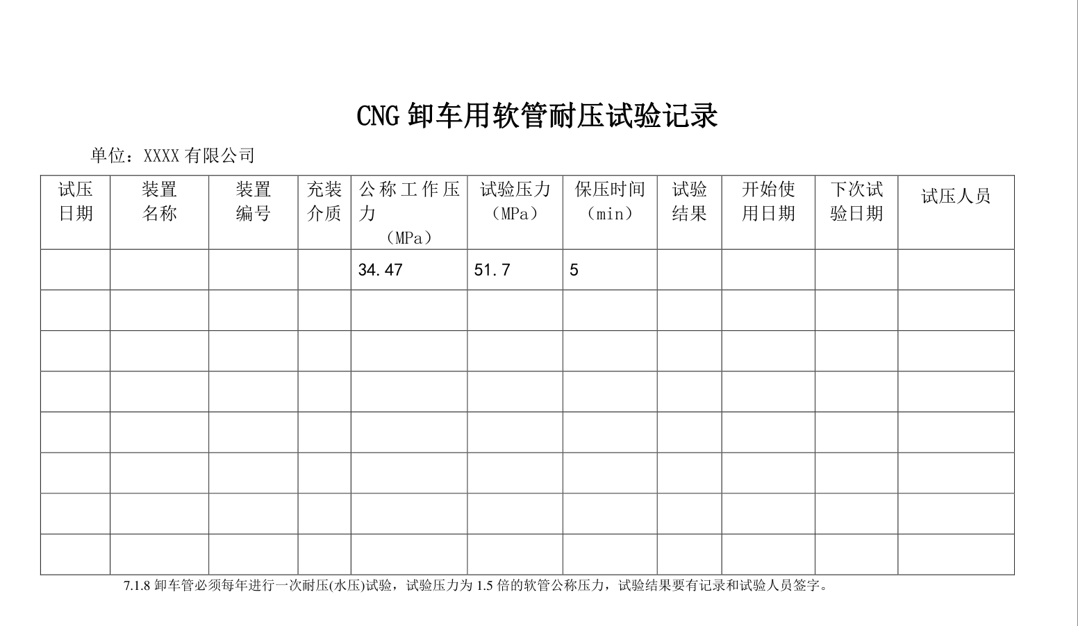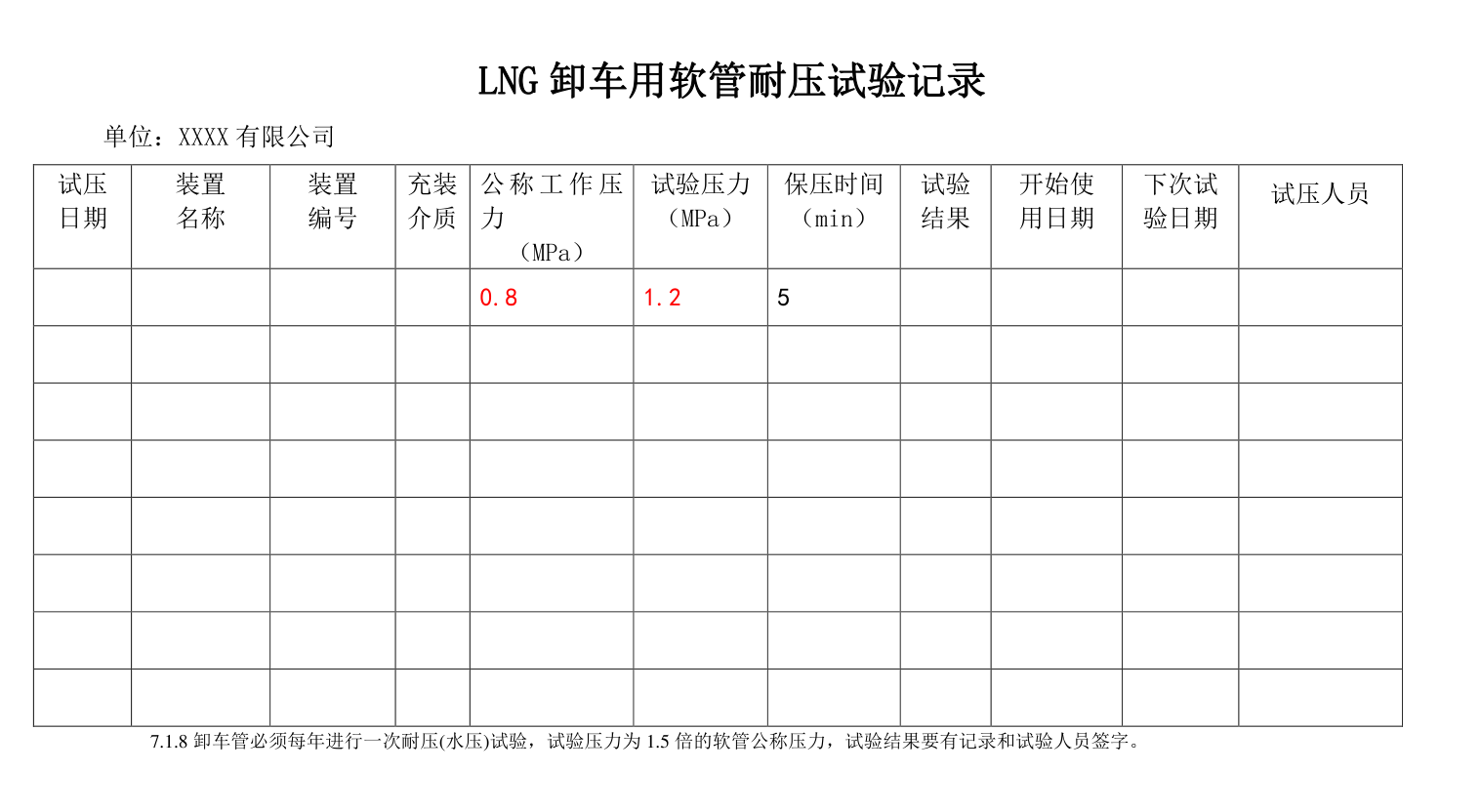 2、 卸車用軟管應(yīng)當(dāng)每年進(jìn)行一次耐壓試驗(yàn)檢查, 試驗(yàn)壓力為卸車用軟管公稱壓力的 1. 5 倍(液化天然氣卸車用管試驗(yàn)壓力為 1. 2MPa);