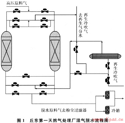 原料氣進裝置區(qū)后首先進入分離器除去游離水和機械雜質(zhì),然后在6.5MPa、25℃條件下進入分子篩干燥器,脫水后干氣露點小于-80℃,干氣進入旋風(fēng)分離器除去分子篩粉末,最后進入輸氣管線。流程如圖1所示: