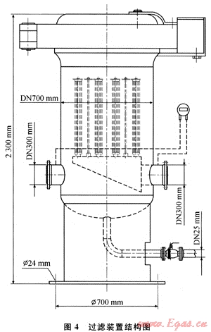 4) 改進過濾裝置,采用HFB/150天然氣高效沉降過濾器,該裝置過濾器由沉降段及過濾段兩部分組成,沉降段由分隔板構(gòu)成一個重力沉降室;過濾段安裝有若干只濾芯。當含塵氣體進入分離器時,在重力作用下先將粗顆粒雜質(zhì)分離,從而減輕了后續(xù)精密濾芯的負荷,較細的雜質(zhì)則隨著氣體由過濾段的濾芯除去,最終氣體得以凈化。改進后的過濾器裝置結(jié)構(gòu)圖見圖4。