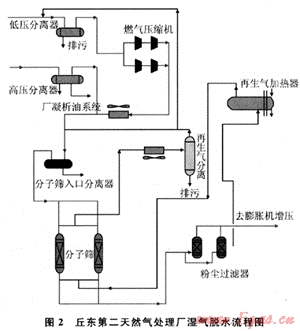 低壓原料氣進裝置區(qū)后首先進行增壓,與中壓天然氣匯合后在3.0MPa、25℃條件下進入分離器除去游離水和機械雜質(zhì),再進入分子篩干燥器,脫水后干氣露點小于-80℃,干氣進入旋風(fēng)分離器除去分子篩粉末,然后進入輸氣管線。流程如圖2所示。
