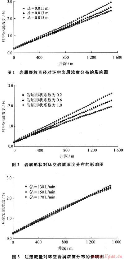 2) 巖屑顆粒直徑、巖屑尺寸和注液流量對環(huán)空巖屑濃度影響比較大,若要對環(huán)空巖屑濃度計算的更準確,需對鉆井產生的巖屑進行統(tǒng)計分析,得到準確的平均巖屑顆粒直徑和形狀系數(shù)。
