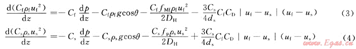 由液固兩相流體力學[6]可得泡沫和巖屑在環(huán)空中一維穩(wěn)定流動的動量方程分別為: