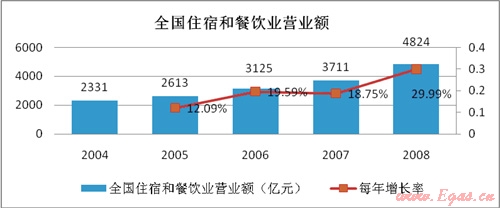 從國家統(tǒng)計(jì)局網(wǎng)站上了解到2008年我國從事住宿和餐飲的企業(yè)法人有37151個(gè),全國餐飲業(yè)營業(yè)額已達(dá)到4824億元,每年的復(fù)合增長率達(dá)到20%。
