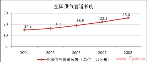 由于瓶裝氣由單獨(dú)的配套計(jì)量儀器,同時(shí)我國《城鎮(zhèn)燃?xì)饧夹g(shù)規(guī)范》規(guī)定使用管道燃?xì)獾挠脩魬?yīng)設(shè)置燃?xì)庥?jì)量裝置。因此,燃?xì)夤艿赖慕ㄔO(shè)將直接影響燃?xì)獗硎袌?。根?jù)《全國城市燃?xì)夤芫W(wǎng)改造規(guī)劃(2008-2010)》,1990年至2006年,城市燃?xì)庑袠I(yè)供求管道長度從2.4萬公里增加到18.9萬公里,增加了近7倍。2002年至2006年,城市燃?xì)夤艿滥暝鲩L1.42-2.74萬公里,平均增長率超過13%,而天然氣管道的平均增長率則超過20%。