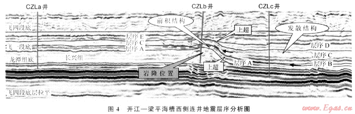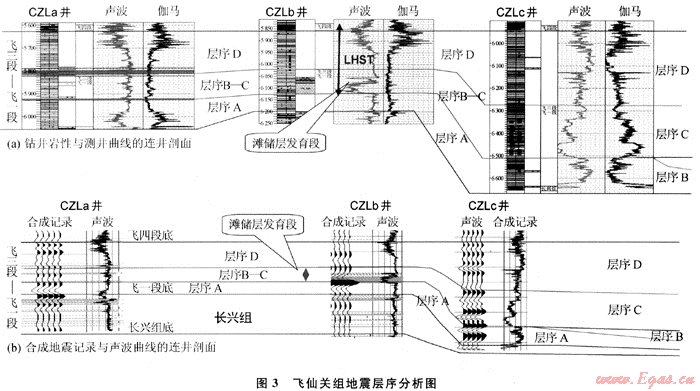圖3是開(kāi)江-梁平海槽西側(cè)分別位于臺(tái)地、生物巖隆和海槽的3口井的連井圖,利用測(cè)井資料與地震資料將飛一段至飛三段劃分出4套地震層序,合成地震記錄中黃色區(qū)域?yàn)閮?chǔ)層段。層序A為高位早期,水體較深,儲(chǔ)層基本不發(fā)育。層序B-C為高位晚期,儲(chǔ)層開(kāi)始發(fā)育,CZLb井位于臺(tái)緣帶上,儲(chǔ)層段聲波曲線明顯降低,其儲(chǔ)層厚度較大,合成記錄上儲(chǔ)層底部地震反射明顯增強(qiáng);開(kāi)闊臺(tái)地內(nèi)CZLa井在層序B-C內(nèi)雖有一定的儲(chǔ)層發(fā)育,但厚度明顯變薄,合成記錄上儲(chǔ)層底部反射異常與臺(tái)緣帶反射相比異?,F(xiàn)象降低;位于深水海槽內(nèi)CZLc井在層序B-C內(nèi)無(wú)儲(chǔ)層發(fā)育。
