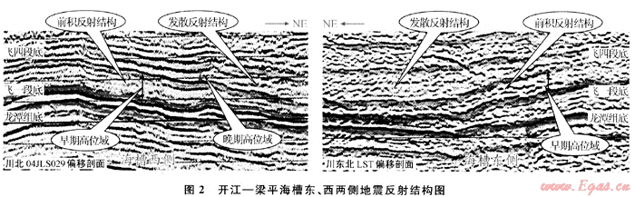礁、灘的發(fā)育與其沉積前的古地貌關(guān)系密切,在高地或淺水臺(tái)地邊緣,其水動(dòng)力相對(duì)較強(qiáng),有利于礁或?yàn)┑纳L(zhǎng)。若古高地暴露地表,則更有利于石灰?guī)r的次生白云化改造,促使優(yōu)質(zhì)儲(chǔ)層發(fā)育[7~8]。斜坡陡緩程度反映了水體能量的高低,圖2為開(kāi)江-梁平海槽東、西兩側(cè)地震剖面,在海槽東西側(cè)具有明顯的前積和發(fā)散反射結(jié)構(gòu),其中前積反射結(jié)構(gòu)為早期高位體系域所具有的特征,發(fā)散反射結(jié)構(gòu)為晚期高位體系域所具有的特征。兩種反射結(jié)構(gòu)表明:飛仙關(guān)組沉積早期是繼承上二疊統(tǒng)沉積方式的欠補(bǔ)償沉積,而非快速充填沉積。