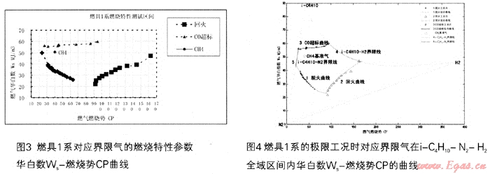 根據(jù)試驗(yàn)測定的燃具1系在脫火、回火及CO超標(biāo)時(shí)所對應(yīng)的原料氣組分,計(jì)算各界限工況點(diǎn)對應(yīng)的燃燒特性參數(shù),包括燃?xì)飧邿嶂礖2、相對密度d、華白數(shù)Ws、燃燒勢CP等,建立直角坐標(biāo)系。繪制華白數(shù)Ws-燃燒勢CP曲線,見圖3;華白數(shù)Ws-燃燒勢CP在i-C4H10-N2-H2區(qū)間內(nèi)的曲線,見圖4。