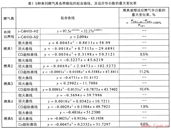 根據(jù)實(shí)驗(yàn)測得的各系列燃具在界限工況時(shí)對應(yīng)界限試驗(yàn)氣的組分?jǐn)?shù)據(jù),計(jì)算得到對應(yīng)燃?xì)獾娜紵匦詤?shù),及圖3~8所示的各特性曲線,進(jìn)行回歸分析與曲線擬合,其擬合曲線見表6。