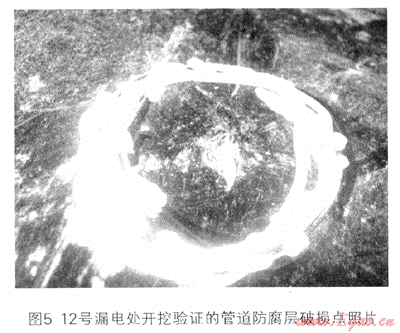 第二外加電流處,極化后,通電電位Von=-1560mV,斷電電位Voff=-1010mV,管道到遠大地點的電位差為VT=550mV,犧牲陽極上形成的電位差VTC為60mV,9~12處漏電點由2號測試樁提供的信號檢出,由表中數(shù)據(jù)可以看出,9號點檢測到的犧牲陽極旁的土壤距遠方大地的電位差Vs與犧牲陽極上形成的電位差VTC基本相當(dāng),初步判斷為犧牲陽極,隨后的開挖驗證證實了此判斷。9、10、12號漏電點的IRC已經(jīng)大于100%,所以判斷這些點連接有犧牲陽極,但不排出伴隨有防腐層破壞。其中12號漏電點的IRC已經(jīng)高達163%,伴隨有管道防腐層破壞的可能性很大。恰好此處具備開挖條件。開挖后發(fā)線該處有犧牲陽極,同時伴隨有管道防腐層破壞,如圖5所示。另外,此12處漏電點相隔距離基本上是相隔200~400m,這也符合一般犧牲陽極埋設(shè)距離,能夠為陽極信號干擾排除提供依據(jù)。