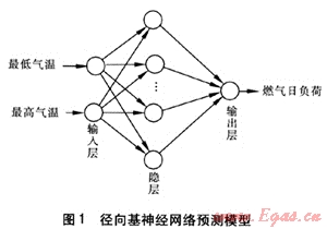 徑向基神經(jīng)網(wǎng)絡(luò)[2]是一種兩層前向型神經(jīng)網(wǎng)絡(luò),包含一個具有徑向基函數(shù)神經(jīng)元的隱層和一個具有線性神經(jīng)元的輸出層。在燃氣短期負荷預(yù)測領(lǐng)域中,它以訓練速度快、學習精度高的優(yōu)點開始逐漸嶄露頭角??紤]到燃氣日負荷受天氣狀況影響比較大,筆者以網(wǎng)絡(luò)的輸入為最低氣溫、最高氣溫,輸出為燃氣日負荷建立徑向基神經(jīng)網(wǎng)絡(luò)預(yù)測模型(見圖1)。