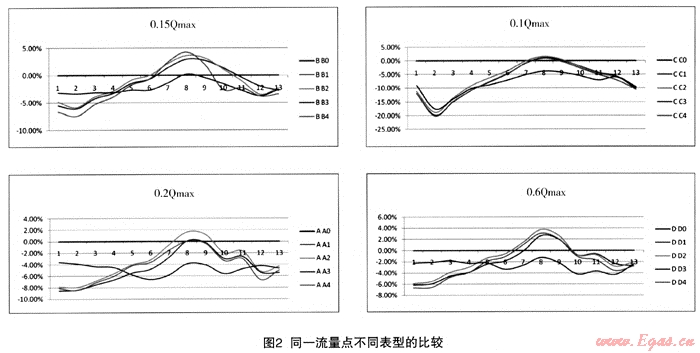 由圖1可以看出,這4種表型在流量不同時,誤差是不一樣的??傮w來看,小流量(0.1Qmax)誤差最大,大流量(0.6Qmax)誤差最小,且與溫度變化相關(guān),如在第2點(對應(yīng)1月份),都有一個驟然下降過程,尤其是小流量誤差曲線最為明顯,主要原因是溫度下降導(dǎo)致。同時也可以看出,小流量時對溫度最為敏感,隨著流量的增大,曲線越平緩,對溫度的敏感度越低,這是一個值得關(guān)注的現(xiàn)象。