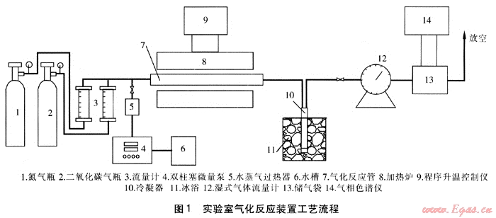 瓶裝氮?dú)饧岸趸細(xì)怏w分別經(jīng)流量計(jì)計(jì)量后進(jìn)入氣化反應(yīng)管;蒸餾水由雙柱塞微量泵計(jì)量后進(jìn)入水蒸氣過(guò)熱器,在水蒸氣過(guò)熱器中氣化為水蒸氣后進(jìn)入氣化反應(yīng)管;氣化反應(yīng)管由帶程序升溫控制儀的加熱爐加熱到設(shè)定溫度;反應(yīng)產(chǎn)生的氣體產(chǎn)物經(jīng)冷凝器冷凝,除去其中的焦油及水蒸氣,經(jīng)濕式氣體流量計(jì)計(jì)量后進(jìn)入儲(chǔ)氣袋,對(duì)儲(chǔ)氣袋中的氣體取樣分析后放空。
