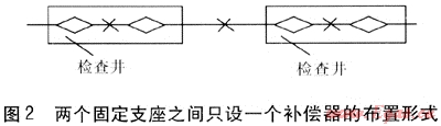 造成這種情況的原因較為復(fù)雜:一是補(bǔ)償器自身質(zhì)量偏差較大,雖型號(hào)規(guī)格相同但剛度差距大,無法自由伸縮;二是受管材加工制作質(zhì)量與安裝質(zhì)量影響,無法自由伸縮,駐點(diǎn)兩側(cè)管道受力不均,造成駐點(diǎn)偏移大,駐點(diǎn)不固定,使波紋管補(bǔ)償器無法承受,最終造成破壞。除非對(duì)補(bǔ)償器自身作較大改進(jìn),保證波紋間均布限位使波紋管補(bǔ)償器剛度均衡趨于一致,否則采用普通補(bǔ)償器條件下,還應(yīng)按照每兩個(gè)固定支座之間只設(shè)一個(gè)補(bǔ)償器的原則進(jìn)行布置(見圖2)。
