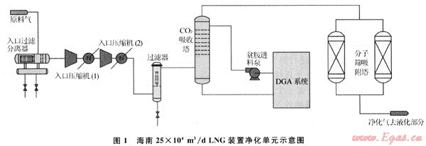 天然氣預(yù)處理系統(tǒng)包括過濾分離、增壓、二甘醇胺(DGA)脫CO2和分子篩干燥部分。流程簡圖見圖1。