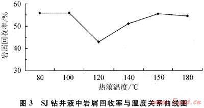 由同2.1.2老化后的鉆井液過40目濕篩后所得巖屑一次回收率,考察溫度對SJ鉆井液中巖屑回收率的影響,即考察溫度對SJ鉆井液的抑制性的影響。
