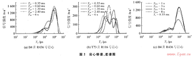 飛仙關(guān)組15塊巖心的差譜實(shí)驗(yàn)結(jié)果表明,不同等待時(shí)間條件下測(cè)量的T2譜形狀基本相似,呈雙峰特征,長(zhǎng)弛豫組分的(大孔徑孔隙)信號(hào)幅度隨等待時(shí)間的增加而增大(圖2-c),表明可以探測(cè)到大孔隙中更多的氫核,等待時(shí)間越長(zhǎng),大孔徑孔隙中的流體極化程度越高。也就是說(shuō)大孔徑孔隙中的流體需要較長(zhǎng)的等待時(shí)間才能得到充分極化,但短弛豫組分的(小孔徑孔隙)信號(hào)幅度在不同的等待時(shí)間下變化不大,表明小孔徑孔隙在較短的時(shí)間內(nèi)氫核就能得到充分極化。圖2-c中:Tw等于6s和8s時(shí),兩弛豫譜線(xiàn)基本重疊,表明當(dāng)?shù)却龝r(shí)間超過(guò)6s時(shí),大孔徑中的氫核達(dá)到完全極化。在6s以?xún)?nèi)的等待時(shí)間,大孔徑中的氫核不能完全極化,故T2譜幅度較小,隨著T2的增大,極化程度增大,T2譜幅度增加,因此出現(xiàn)大的差譜信號(hào)。