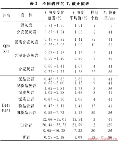 通過(guò)對(duì)216塊巖樣的T2截止值實(shí)驗(yàn),結(jié)果表明:孔隙度大小對(duì)R截止值影響沒(méi)有明顯的規(guī)律,泥質(zhì)含量高低與T2截止值有一定的統(tǒng)計(jì)規(guī)律,一般情況下,泥質(zhì)含量高的碳酸鹽巖的T2截止值一般較小(表2),普遍在41ms左右;而泥質(zhì)含量低,巖性較純的碳酸鹽巖的T2截止值普遍較泥質(zhì)含量高的巖樣的T2截止值高,在86ms左右。因此碳酸鹽巖地層核磁共振測(cè)井的T2截止值不應(yīng)是定值,它與泥質(zhì)含量成反比關(guān)系[6]。
