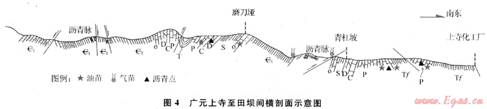 不難看出,該古隆起經(jīng)云貴、冶里和志留紀末的加里東運動,遭強烈剝蝕,從隆起核部向四周已露出了下寒武統(tǒng)九老洞組-奧陶系巖層,部分還殘留了少量志留系泥頁巖,其后于其上相繼沉積了泥盆系、石炭系及其以上地層。盡管從全盆地來看,燈影組和九老洞組烴源巖于志留紀時(也可能是志留紀末,因田壩田1井于九老洞組曾返出原油)已達到生油高峰期,然而對天井山古隆起來說卻是例外,因其上覆的巖層已遭到嚴重剝蝕,地溫已大幅下降,其后繼續(xù)生成的石油,至少至三疊紀地溫才能再次達到生油主峰期,而早期生成的油氣一部分已從剝露出來的寒武系-奧陶系巖層中散去。由于上覆巖一般皆很致密,晚期生成的油氣雖于三疊紀已達到生油高峰期,但生成的油氣可能僅有一部分已運移入奧陶系、二疊系及三疊系的碳酸鹽巖古巖溶縫、洞和沉積原生孔隙中,但絕大部分的油氣仍滯留于生油母巖中,并可能于新生代時才開始進入成氣階段,使石油裂解為天然氣,而在其尚未完全裂解為氣時,喜馬拉雅山造山運動便發(fā)生了,油氣伴隨斷褶全面向上運移,但遇阻后仍有不少滯留于斷帶和九老洞組裂縫中,如圖4和表4、5中所見。目前所見到的瀝青脈應(yīng)是喜山期后,經(jīng)過漫長地質(zhì)歲月的剝蝕后,裸露出來并遭強烈氧化變成的硬性固體瀝青。這已于1967年在田壩從九老洞組向下曾鉆田1井,于井深134.8m放空0.10m,井深220m、333~335.5m,曾先后返出原油2kg及30kg,井口有潮涌現(xiàn)象,得到了證實。
