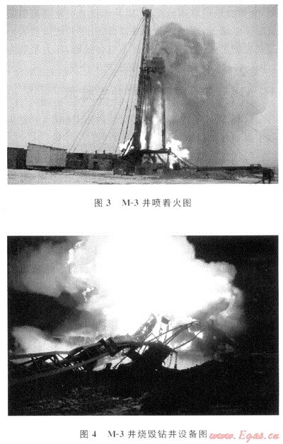 5) M-3井:于2004年2月8日開鉆,套管下深Ø324mm×146m,2004年2月15日使用Ø295.3mm鉆頭鉆至401m完鉆,鉆井液性能:密度為1.16g/cm3;黏度為48s,在316~323m井段,打開淺氣層。循環(huán)后全烴為0.5%,起鉆至井深316m,循環(huán)1h全烴由25%降至0.2%,至2004年2月16日起鉆至井深300m,發(fā)現(xiàn)溢流,當(dāng)搶接方鉆桿時(shí),氣體和鉆井液混合物涌出轉(zhuǎn)盤面,關(guān)井失敗,井噴失控、著火、燒毀設(shè)備(見圖3、4)。經(jīng)過拆除、清理被毀設(shè)備,爆破滅火,更換井口裝置,連接液壓控制管線,關(guān)閉防噴器之后,注水泥塞,該井工程報(bào)廢(大火燃燒6d)。