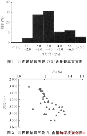 研究區(qū)須五段的有機質干酪根為典型的腐殖型,總有機碳含量多分布于1%~8%之間(占到統(tǒng)計樣品總數(shù)的90%以上),主峰為2%~4%(圖1),最大可達到18.9%,計算平均值為4.0%。因此,較高的總有機碳含量有利于頁巖氣的生成和吸附富集。須五段有機質成熟度隨深度增加而變大的規(guī)律比較明顯,測試數(shù)據(jù)結果主要分布在1.01%~1.68%,平均值為1.3%,處于成熟-高成熟過渡階段(圖2),可視為處于頁巖氣發(fā)育的最有利階段。