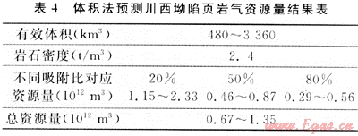 川西坳陷上三疊統(tǒng)須五段在區(qū)內穩(wěn)定連續(xù)發(fā)育,總面積約1.44×104km2,有效厚度為50~350m[11],總有機碳含量平均達4%,Ro在1.3%左右。對美國五大盆地頁巖進行分析認為頁巖氣在總有機碳含量為0.3%、有機質成熟度為0.4%時也可具備形成頁巖氣的源巖條件[6]。因此以TOC=0.3%和Ro=0.4%的頁巖氣發(fā)育條件為下限,以頁巖中的工業(yè)含氣量標準[19~20]歸為依據(jù),厘定須五段頁巖發(fā)育有效體積為480~3360km3,研究區(qū)泥質烴源巖密度平均值為2.4t/m3。結合對泥頁巖含氣量所進行的統(tǒng)計分析,可選擇吸附量2~4m3/t進行計算。頁巖氣中以吸附狀態(tài)存在的天然氣含量變化于20%~85%之間[21]。根據(jù)相關公式計算可得該區(qū)須五段的頁巖氣資源量為0.67×1012~1.35×1012m3(表4)。
