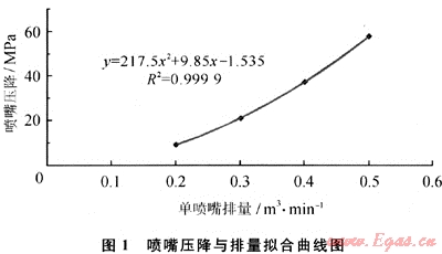 (式中Q為排量;A為過(guò)流面積)。因此,對(duì)試驗(yàn)測(cè)定結(jié)果進(jìn)行平方擬合即可得到噴嘴壓降與排量的關(guān)系,對(duì)常用Ø6mm噴嘴進(jìn)行擬合(圖1)得到如下關(guān)系式: