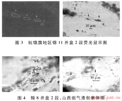 測試結(jié)果表明,包裹體絕大多數(shù)屬于氣液兩相包裹體,個(gè)別探井存在含油包裹體,顯微鏡下有明顯的熒光現(xiàn)象(圖3)。宿主礦物為石英,一般在裂縫中成串分布(圖4),形態(tài)不規(guī)則,大小為2~4μm,氣液比較低,一般在5%左右,包裹體顏色主要呈黑色或無色(占絕對優(yōu)勢)。包裹體鹽度基本上反映了地質(zhì)歷史時(shí)期包裹體形成時(shí)水介質(zhì)的含鹽度。本區(qū)上古生界古鹽度分布在0~8%,表明當(dāng)時(shí)研究區(qū)沉積水古鹽度比較淡,屬于潮濕環(huán)境。