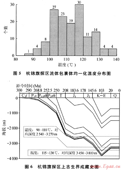 流體包裹體是礦物結(jié)晶過程中捕獲于晶體中的成巖成礦流體,是流體生成、運(yùn)移、聚集過程中遺留下來的原始樣品和歷史記載,直接記錄了沉積盆地油氣成藏的條件及過程。通常由包裹體恢復(fù)古地溫,根據(jù)古地溫梯度進(jìn)一步確定包裹體的形成深度,再根據(jù)研究區(qū)的沉積埋藏史和熱演化史來確定包裹體的形成時(shí)間,進(jìn)而確定油氣的充注時(shí)間[4、8]。