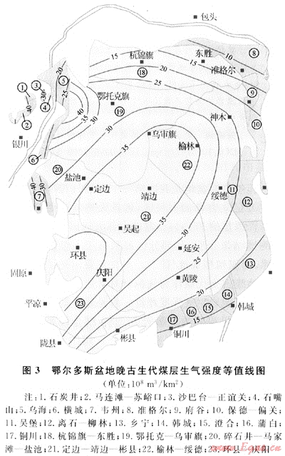 為了便于研究和論述,考慮煤田地理位置、構(gòu)造、煤變質(zhì)程度、煤層厚度等因素將全盆地分為23個區(qū)塊,邊淺部采用原有煤田、煤礦區(qū)的分區(qū),中深部將內(nèi)蒙古分為杭錦旗-東勝和鄂托克-烏審旗2個區(qū)塊;將陜西省分為靖邊彬縣和榆林-綏德2個區(qū)塊,將甘肅省分為環(huán)縣-慶陽和華亭-慶陽2個區(qū)塊及寧夏的碎石井-鹽池區(qū)塊。筆者共收集了292組顯微組分?jǐn)?shù)據(jù),根據(jù)盆地邊淺部山西蒲縣、偏關(guān)、寧夏石溝驛等地煤的3大顯微單組分在相應(yīng)熱成熟階段的煤氣發(fā)生率[16~17]乘以某一區(qū)塊實測的顯微組分含量,然后相加得到該區(qū)塊的煤氣發(fā)生率區(qū)間值,結(jié)合厚度等值線圖、容重依次計算出邊淺部各煤田煤的生氣強度;盆地中深部缺乏實測顯微組分?jǐn)?shù)據(jù),依據(jù)原煤熱模擬實驗結(jié)果、煤的熱成熟度及厚度等值線、容重計算得到生氣強度,其分布狀況如圖3所示。