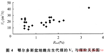 煤階是影響煤對甲烷吸附能力最為重要的因素。Kaiser等[18]認(rèn)為,在煤化作用階段早期,煤中發(fā)育的孔隙主要為原生大孔隙且含有大量的羥基和羧基官能團,此時煤親水而疏甲烷,造成平衡水分含量非常高,但吸附能力較低,隨煤階增高,原生大孔隙急劇減少,熱變氣孔逐漸增多,羥基和羧基官能團大量脫落,使得煤的親甲烷能力顯著增加,同時熱變氣孔的大量形成,為甲烷吸附提供了空間[18~19],所以高煤級煤對甲烷的吸附能力一般強于低煤級煤。盆地晚古生代煤的VL隨熱成熟度提高呈“U”型趨勢變化(見圖4),當(dāng)0.40%<Rmax<0.80%時,隨煤階增大,煤對甲烷的吸附能力迅速下降,以Rmax=0.8%為臨界點,在0.8%<Rmax<4.0%時,最大吸附氣量隨煤階增大而增加。由于盆地中深部目前沒有實測的VL數(shù)據(jù),參考盆地邊淺部煤的U在0.8%<Rmax<4.0%區(qū)間內(nèi)隨煤階的變化規(guī)律,筆者根據(jù)中深部煤的熱成熟度分布特點對煤的最大吸附能力進(jìn)行了推測,并結(jié)合現(xiàn)存煤炭資源量推算出全盆地中深部晚古生代煤對甲烷的理論吸附氣量為51.92×1012m3。