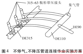 我們?cè)诮蚰祥_(kāi)發(fā)區(qū)(東區(qū))建龍分子篩天然氣工程中進(jìn)行該方法的實(shí)施作業(yè)。該工程新建DE90燃?xì)夤艿琅c已運(yùn)行DE315燃?xì)夤艿肋B接,由于園區(qū)內(nèi)無(wú)法實(shí)施停氣降壓作業(yè),經(jīng)研究采用了鞍形帶壓接頭并聯(lián)方案。不停氣、不降壓管道連接作業(yè)實(shí)施方案見(jiàn)圖4。管道連接作業(yè)完成后,經(jīng)對(duì)用戶實(shí)際用氣設(shè)備燃?xì)饬髁俊毫z測(cè),完全符合設(shè)計(jì)要求。此管道連接作業(yè)方法現(xiàn)已在我公司推廣使用,大大減少了氣量損失,加快了管道連接作業(yè)進(jìn)度。但也存在不足之處,如DN 150mm以上管道若實(shí)施此方案,所需鞍形帶壓接頭數(shù)量過(guò)多,與集氣管連接受環(huán)境限制較大,因此在大管徑應(yīng)用上具有局限性。