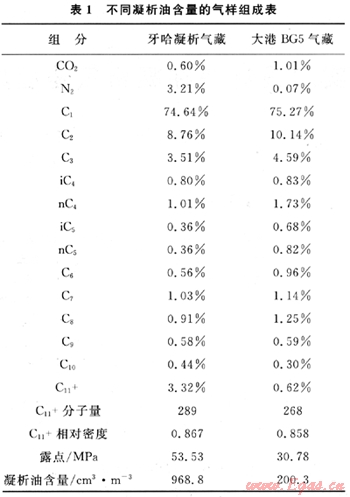 在本次研究中,分別采用了大港油田BG5氣藏和塔里木牙哈凝析氣藏的兩種代表性流體樣品。兩種凝析氣樣品的露點(diǎn)和凝析油含量差別比較大,具體組成和性質(zhì)參數(shù)見表1。