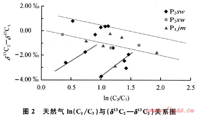 與干酪根初次裂解氣相比,原油二次裂解氣以C3的遞減速率高為特征。因此,利用(δ12C2-δ13C3)值與ln(C2/C3)值相關(guān)關(guān)系可有效區(qū)分干酪根初次裂解氣和原油二次裂解氣[11~12]。據(jù)此可判斷下烏爾禾組天然氣均為原油二次裂解成因氣,而佳木河組和上烏爾禾組天然氣成因類型相對(duì)多樣,既有干酪根初次裂解成因天然氣,也有原油二次裂解成因氣,同時(shí)也可能存在二者混合氣(圖2)。