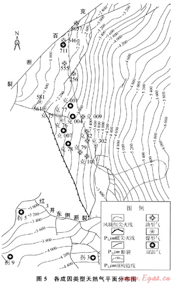 中拐-五、八區(qū)不同成因類型的天然氣在縱向分布上比較復(fù)雜,佳木河組和上烏爾禾組內(nèi)天然氣類型多樣,而位于其二者之間的下烏爾禾組天然氣類型單一。這一分布現(xiàn)象與地層沉積特征密切相關(guān)。下烏爾禾組展布范圍相對(duì)下伏風(fēng)城組較小,受風(fēng)城組烴源巖阻隔的影響,僅能捕獲源自風(fēng)城組烴源巖的油型氣;上烏爾禾組沉積范圍廣,超覆在下伏地層之上,底部為一重要的區(qū)域不整合,具有捕獲源白風(fēng)城組烴源巖的油型氣和源自佳木河組烴源巖的煤型氣的條件;佳木河組頂部同樣為研究區(qū)內(nèi)一重要的不整合面(受強(qiáng)烈剝蝕地區(qū)和上烏爾禾組底部不整合相重合),源自風(fēng)城組烴源巖的油型氣可沿該不整合運(yùn)移進(jìn)入佳木河組,與佳木河組烴源巖自身生成的煤型氣相混合形成混源氣,具體表現(xiàn)為在距佳木河組頂部不整合面較遠(yuǎn)的位置(一般大于300m)分布的均為典型的煤型氣,而在距其頂部不整合面較近的位置(一般小于200m)分布的以混源氣為主。