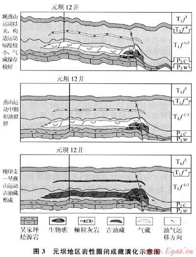 元壩地區(qū)巖性圈閉形成早,油氣配置關(guān)系良好。研究表明圈閉的成藏演化主要經(jīng)歷古油藏形成、原油裂解成氣藏及后期構(gòu)造抬升3個階段(圖3)。