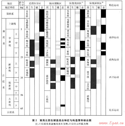 系指北部灣盆地,位于華南板塊南緣,疊置于古生界粵桂隆起區(qū)和中生界海南隆起區(qū)基底之上。古近紀(jì),在區(qū)域張應(yīng)力作用下,產(chǎn)生一系列北東-南西向和近東西向的基底大斷裂,形成眾多半地塹、地塹和地壘構(gòu)造;新近紀(jì)開(kāi)始則產(chǎn)生裂后沉降,形成統(tǒng)一的中深邊淺的整體海相坳陷沉積。以區(qū)域不整合面為界,劃分為古近系陸相斷陷和新近系裂后海相坳陷2大構(gòu)造層系,以陸相沉積為主,其上披覆的海相層序較薄。