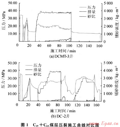 2000型壓裂車及XJ-250型修井機、ACF-700型洗井泵車、數(shù)據(jù)采集與監(jiān)控車等設備完成壓裂工作量7層次,共計加入蘭州產(chǎn)0.5~1.2mm石英砂167.17m3,共使用前置液、攜砂液及頂替液2783.17m3,C25煤層砂比為8.0%~10.8%,C19+C23煤層砂比為4.3%~11.6%。