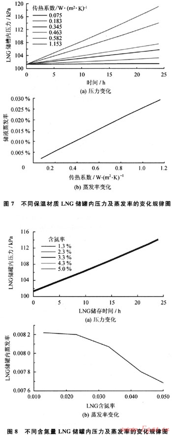 含氮量越高LNG的蒸發(fā)率越低,對LNG儲罐內(nèi)壓力影響不大,向LNG儲罐內(nèi)充注氮氣可以有效地降低罐內(nèi)液體的蒸發(fā)率。