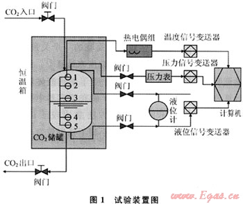 由于LNG的危險性,直接進行大容量LNG儲罐的試驗非常困難,而模擬的理論基礎(chǔ)是氣液相平衡原理,對于各種尺度LNG儲罐都是適用的。因此本試驗采用小型儲罐,用C02介質(zhì)代替LNG進行低溫液體蒸發(fā)率試驗,測試該低溫液體儲罐靜態(tài)蒸發(fā)率,通過試驗來驗證模型的準(zhǔn)確性,然后用研制并完善的模型來研究大尺度的LNG儲罐內(nèi)的蒸發(fā)規(guī)律[12]。